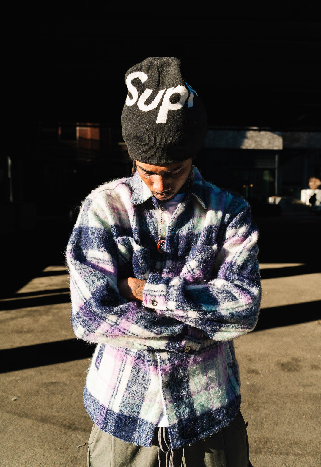 Person wearing a black hoodie and pants with text and heart designs, standing in an alleyway.